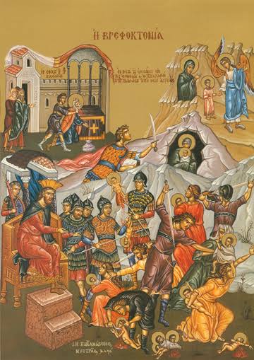 Ketika orang Majus dari timur tidak kembali ke Yerusalem dari Betlehem untuk memberi tahu Herodes tentang Raja yang baru lahir tetapi, atas perintah malaikat, kembali ke tanah air mereka melalui jalan lain, Herodes menjadi murka seperti binatang buas dan memerintah semua anak yang berusia di bawah dua tahun di Bethlehem dan sekitarnya untuk dibunuh. Perintah raja yang menakutkan ini dilakukan sesuai dengan surat peraturan yang ia buat. Tentara memenggal beberapa anak dengan pedang, menghantamkan yang lain ke batu, menginjak-injak yang lain di bawah kaki, dan mencekik yang lain dengan tangan mereka. Tangisan dan ratapan para ibu naik ke surga, Ratapan, dan tangisan pahit; Rahel menangisi anak-anaknya (Yeremia 31:15, Matius 2:18), seperti telah dinubuatkan. Kejahatan terhadap banyak anak yang tidak bersalah ini dilakukan setahun setelah kelahiran Kristus, pada saat Herodes berusaha menemukan Bayi Yesus. Dia bertanya pada Zachariah tentang putranya Yohanes, sehingga dia dapat membunuhnya, karena dia mengira bahwa Yohanes adalah raja baru itu. Karena Zachariah tidak menyerahkan Yohanes, dia dibunuh di Bait Suci atas perintah Herodes. St. Simeon sang Penerima Tuhan juga akan dibunuh segera setelah Penyerahan Yesus ke Bait Allah, seandainya dia belum meninggakan dunia ini. Setelah membunuh anak-anak di Bethlehem, Herodes berbalik melawan para tetua Yahudi yang telah mengungkapkan kepadanya di mana Mesias akan lahir. Dia kemudian membunuh Hyrcanes, Imam Besar, dan tujuh puluh tetua Sanhedrin. Jadi, mereka yang telah setuju dengan Herodes bahwa Bayi raja yang baru harus dibunuh mereka juga berakhir dengan kematian. Setelah itu, Herodes membunuh saudara laki-laki, perempuan, istri dan ketiga putranya. Akhirnya hukuman Allah datang padanya: dia mulai gemetar, kakinya bengkak, bagian bawah tubuhnya menjadi busuk, dan cacing keluar dari luka; hidungnya tersumbat dan bau yang tak tertahankan keluar dari dirinya. Sebelum menghembuskan nafas terakhir, dia ingat ada banyak tawanan orang Yahudi di penjara, dan dia memerintahkan agar mereka semua dibunuh agar mereka tidak bersukacita atas kematiannya. Dengan demikian, penguasa yang mengerikan ini menyerahkan jiwanya dengan tidak manusiawi dan menyerahkannya kepada iblis untuk menjadi miliknya secara kekal.